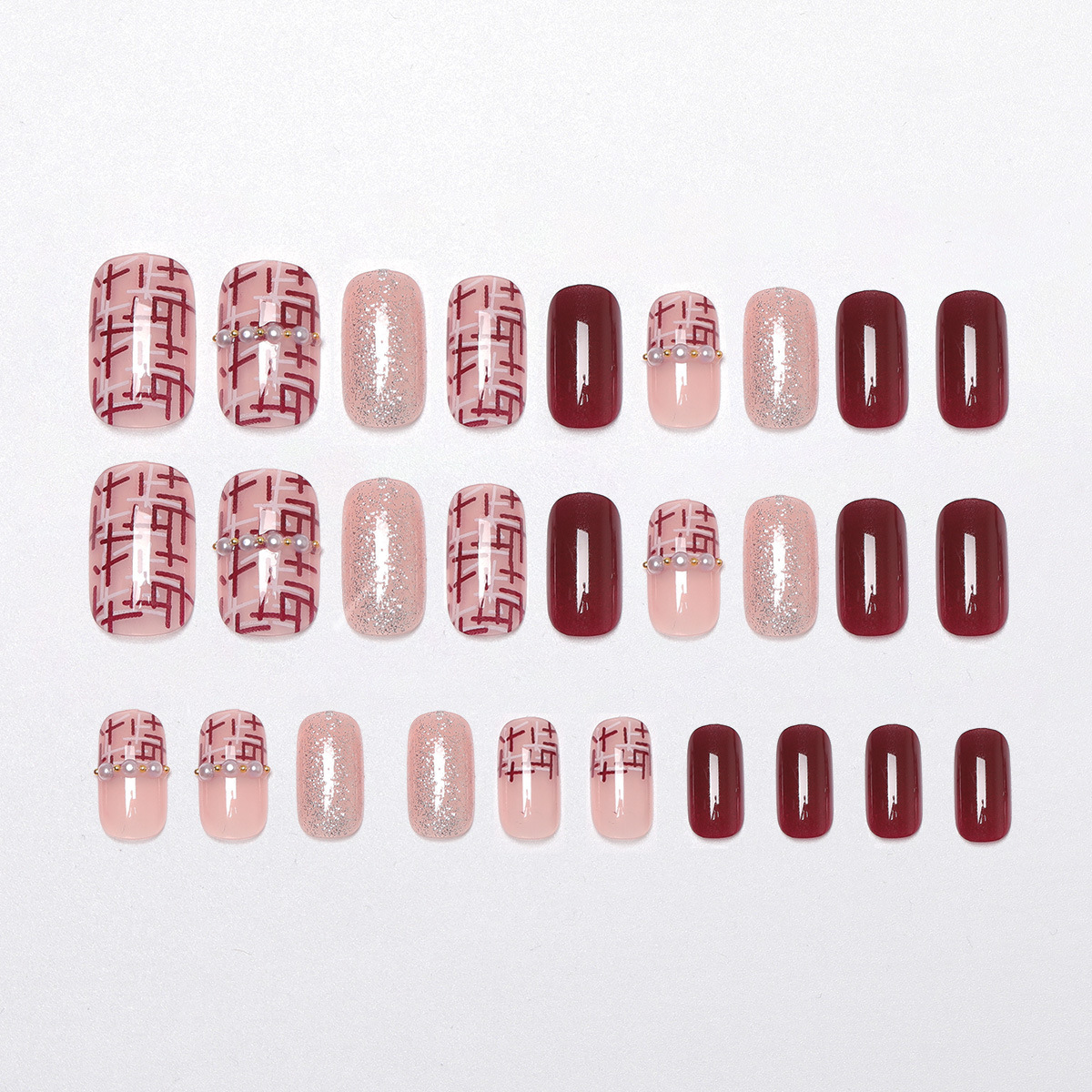 17POOL💙 P137 แดง ยาวกลาง ประกายเงิน เล็บปลอม เร็จรูป กันน้ำ กล่อง 24 ชิ้น