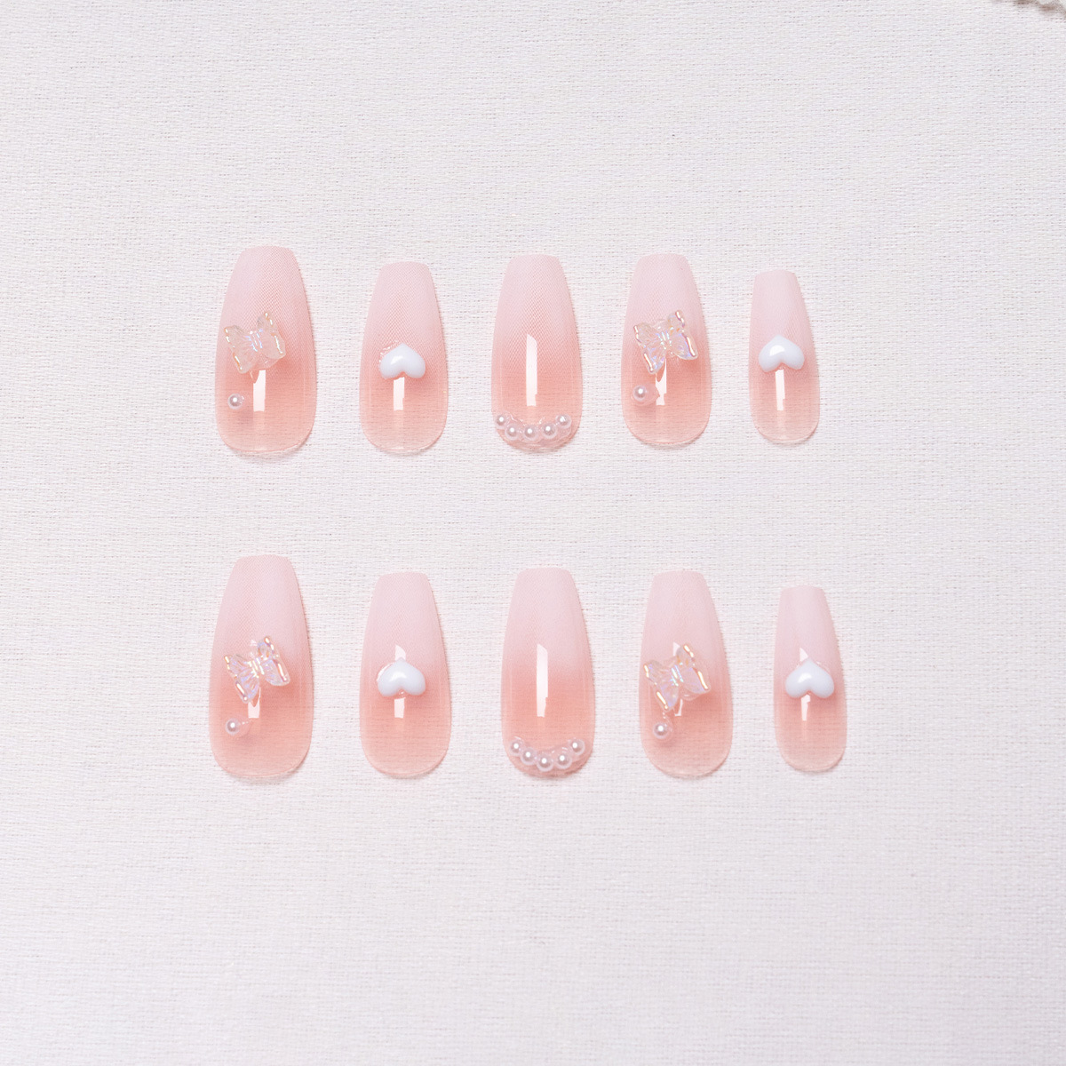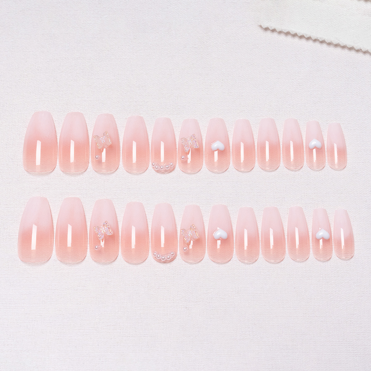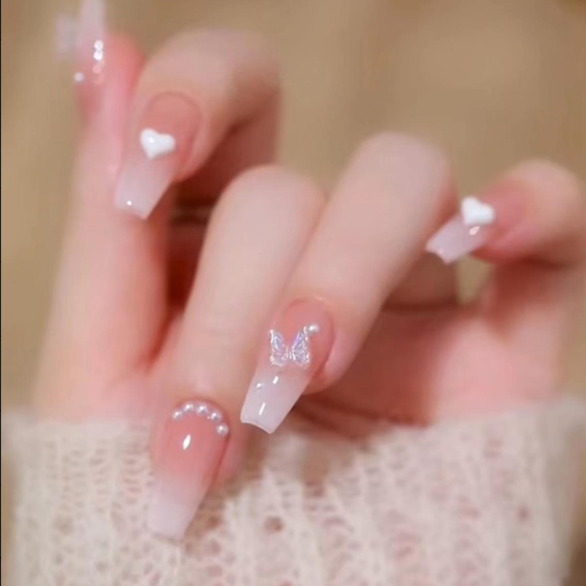17POOL💙 P133 ผีเสื้อ ประดับมุก เล็บปลอม เล็บยาว เร็จรูป กันน้ำ กล่อง 24 ชิ้น