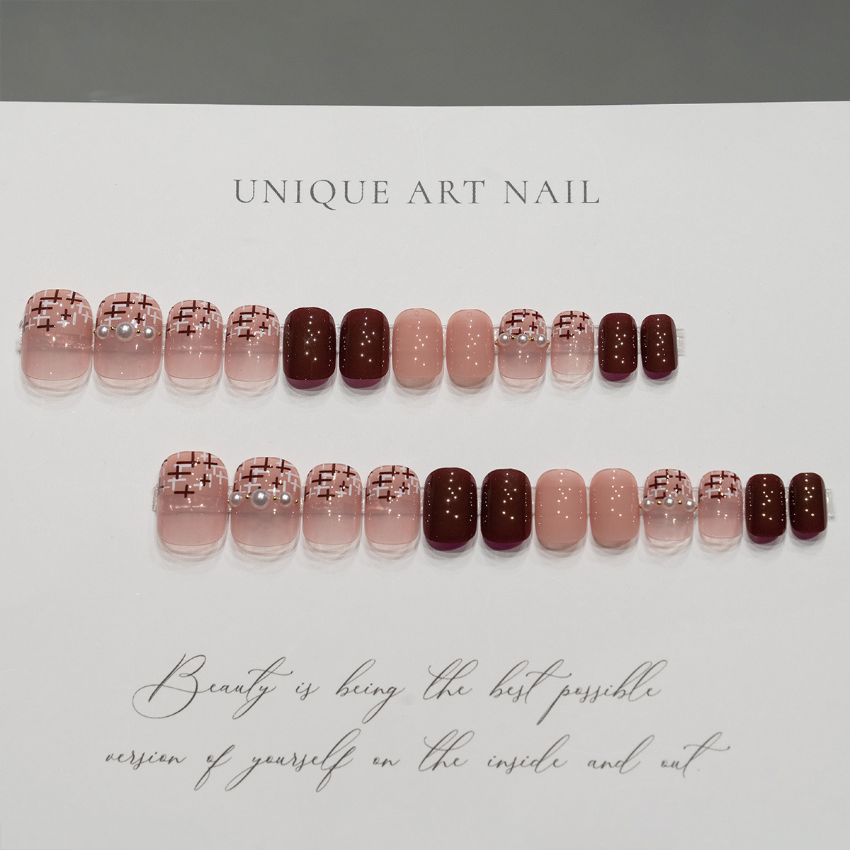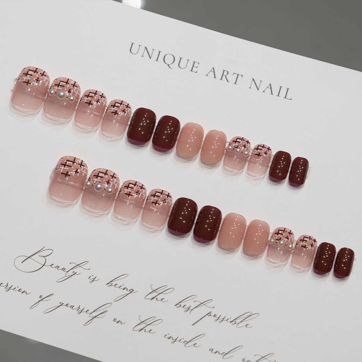 17POOL💙 P132 น้ำตาล ประดับมุก เล็บปลอม เล็บสั้น เร็จรูป กันน้ำ กล่อง 24 ชิ้น