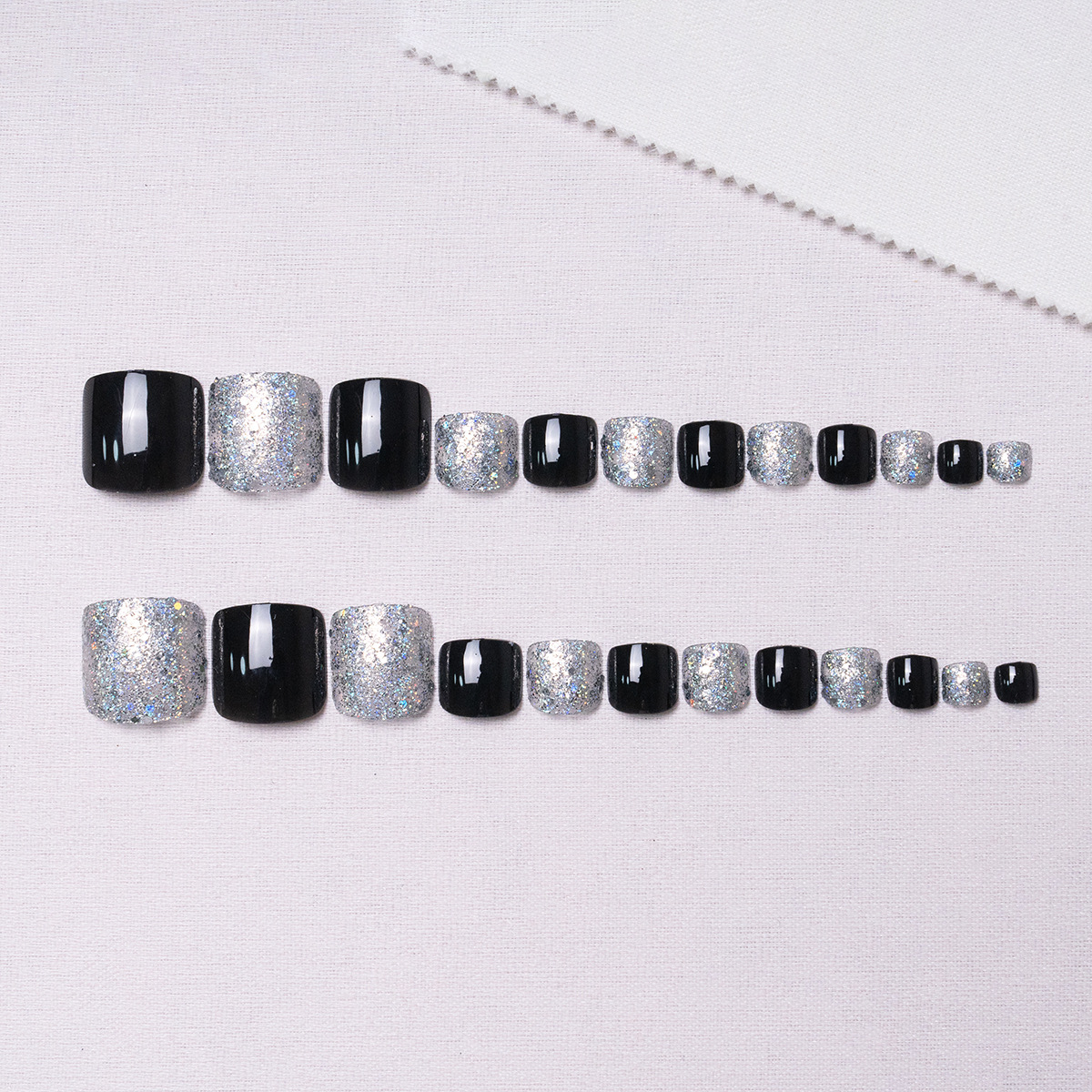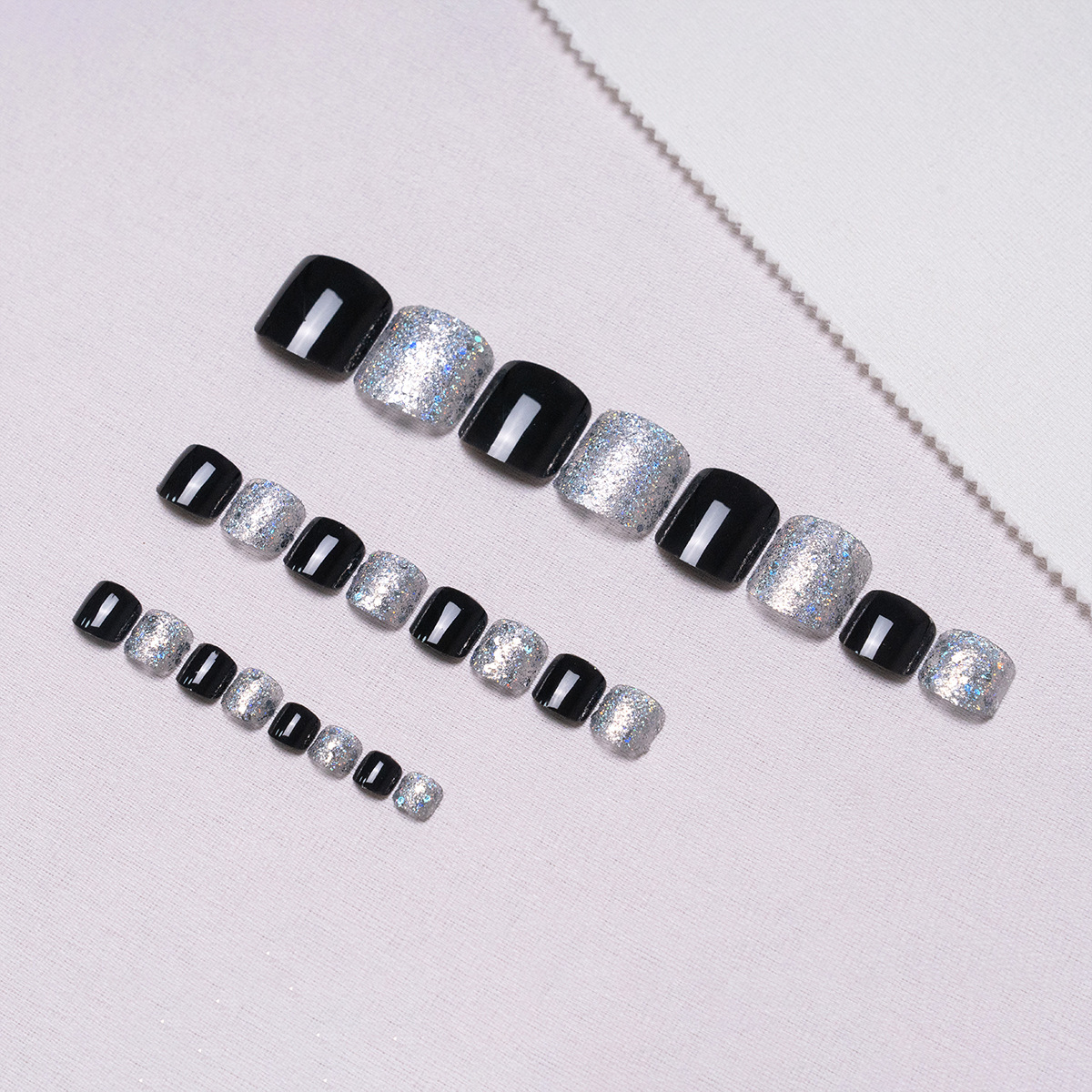 17POOL💙 PF10 เล็บเท้า สีดำ ประกายเงิน เล็บปลอม สำเร็จรูป กันน้ำ กล่อง 24 ชิ้น