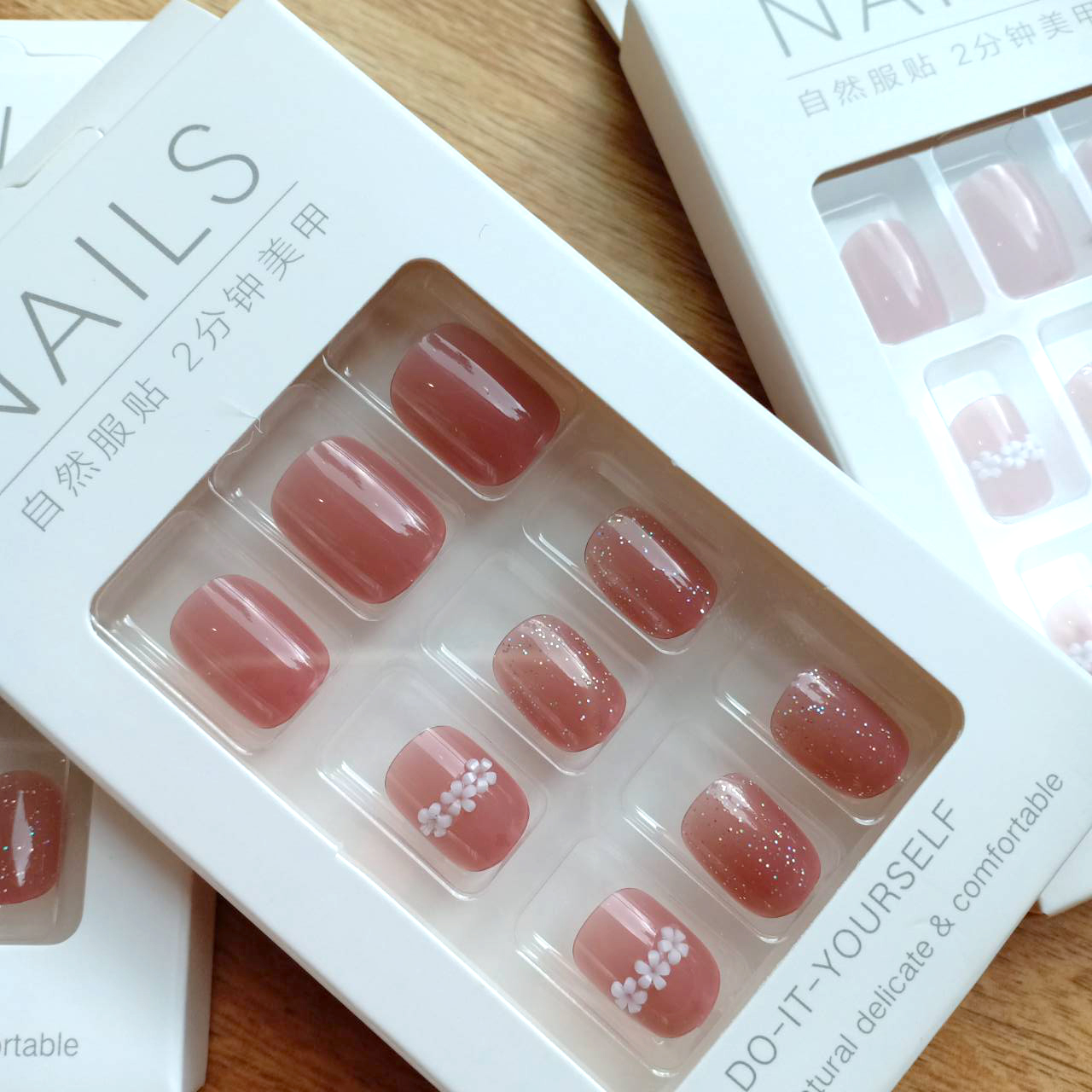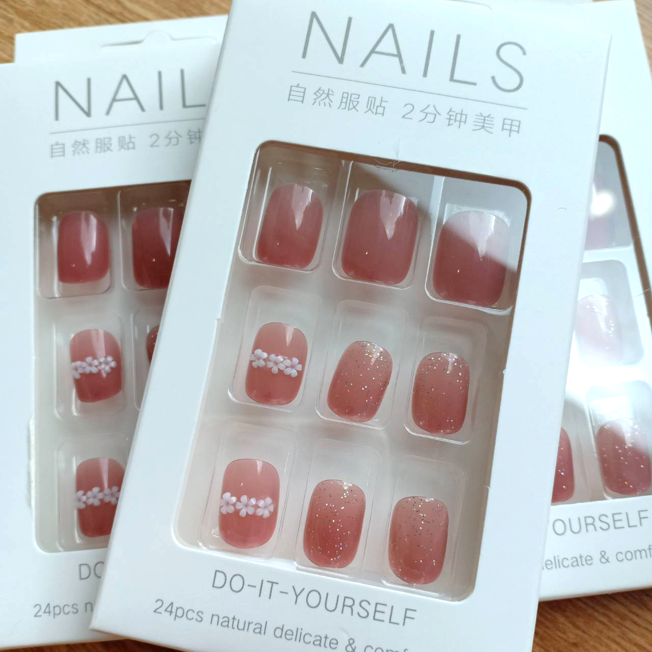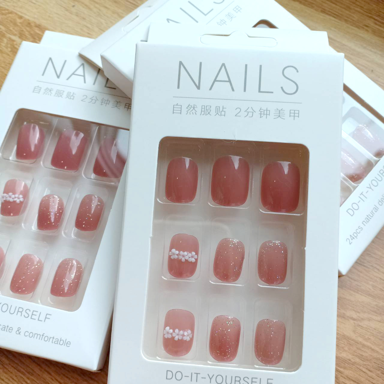 • 17POOL💙 P061 ชมพู ประกาย ดอกไม้ ขาว นู๊ด เล็บปลอม สำเร็จรูป กันน้ำ กล่อง 24 ชิ้น